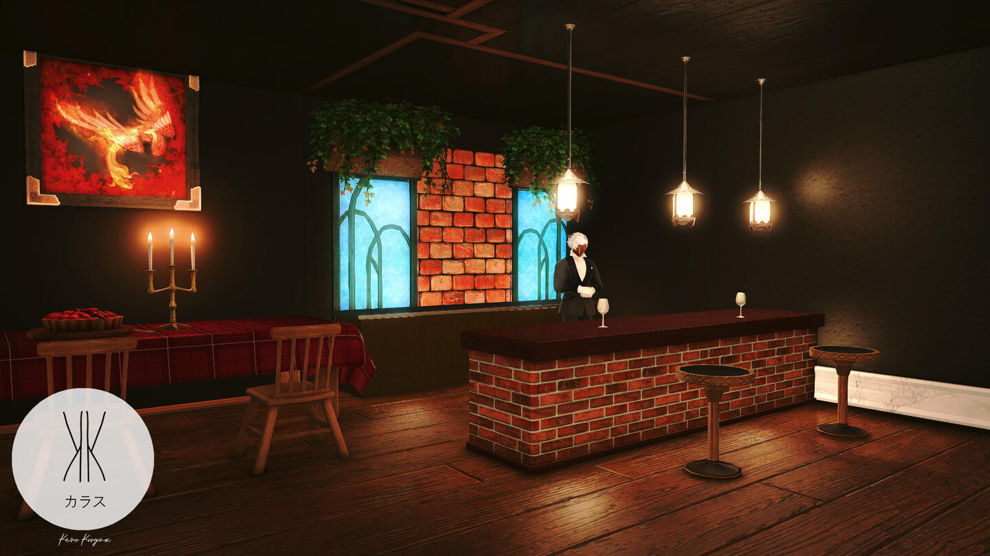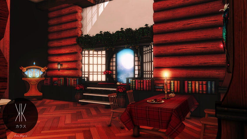 Complex design of multiple themes. Main part was kugane market inside the house, then elegant bar, chill hang out spot that should represent comic books library - living room combination, upper floor being personal office of the FC owner and mini-gold saucer room.